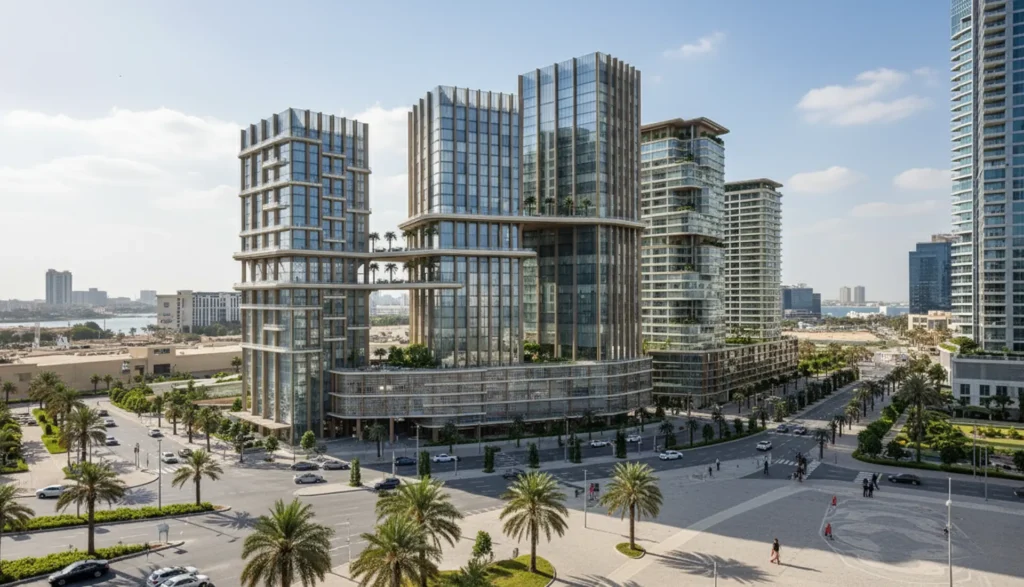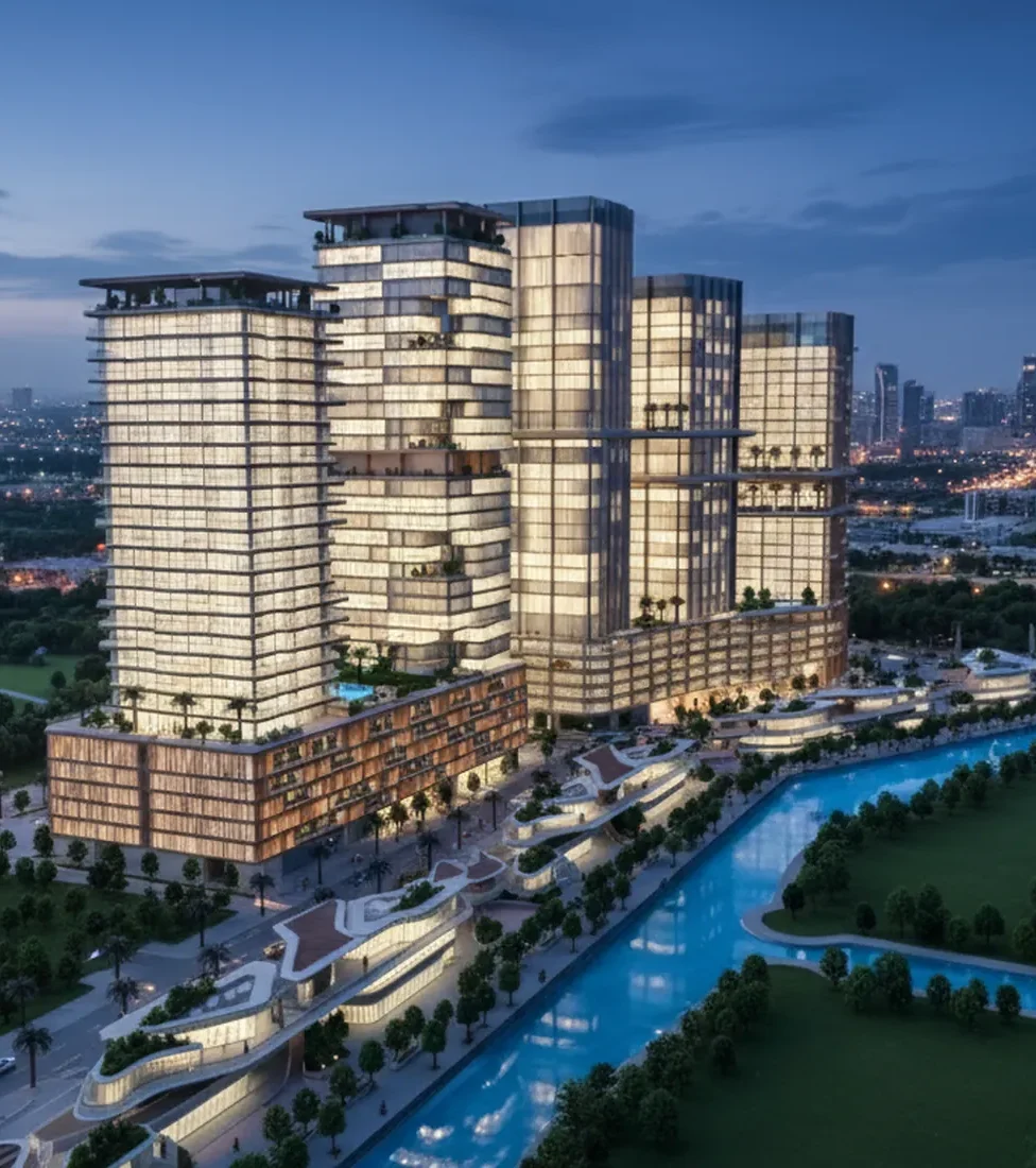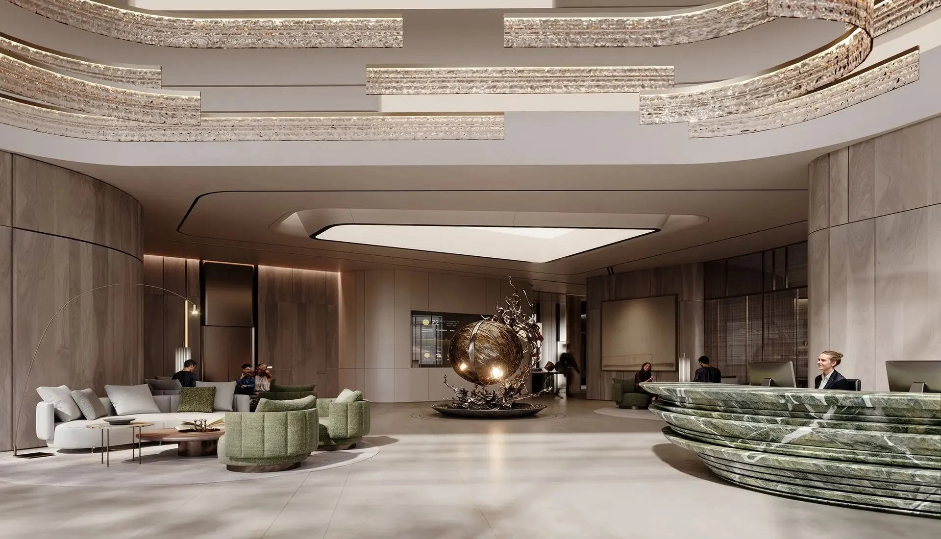 Radiant Atrium features iconic towers with floor-to-ceiling glass, offering natural light, panoramic city, island, and marina views. The design seamlessly blends luxury, functionality, and aesthetic appeal.